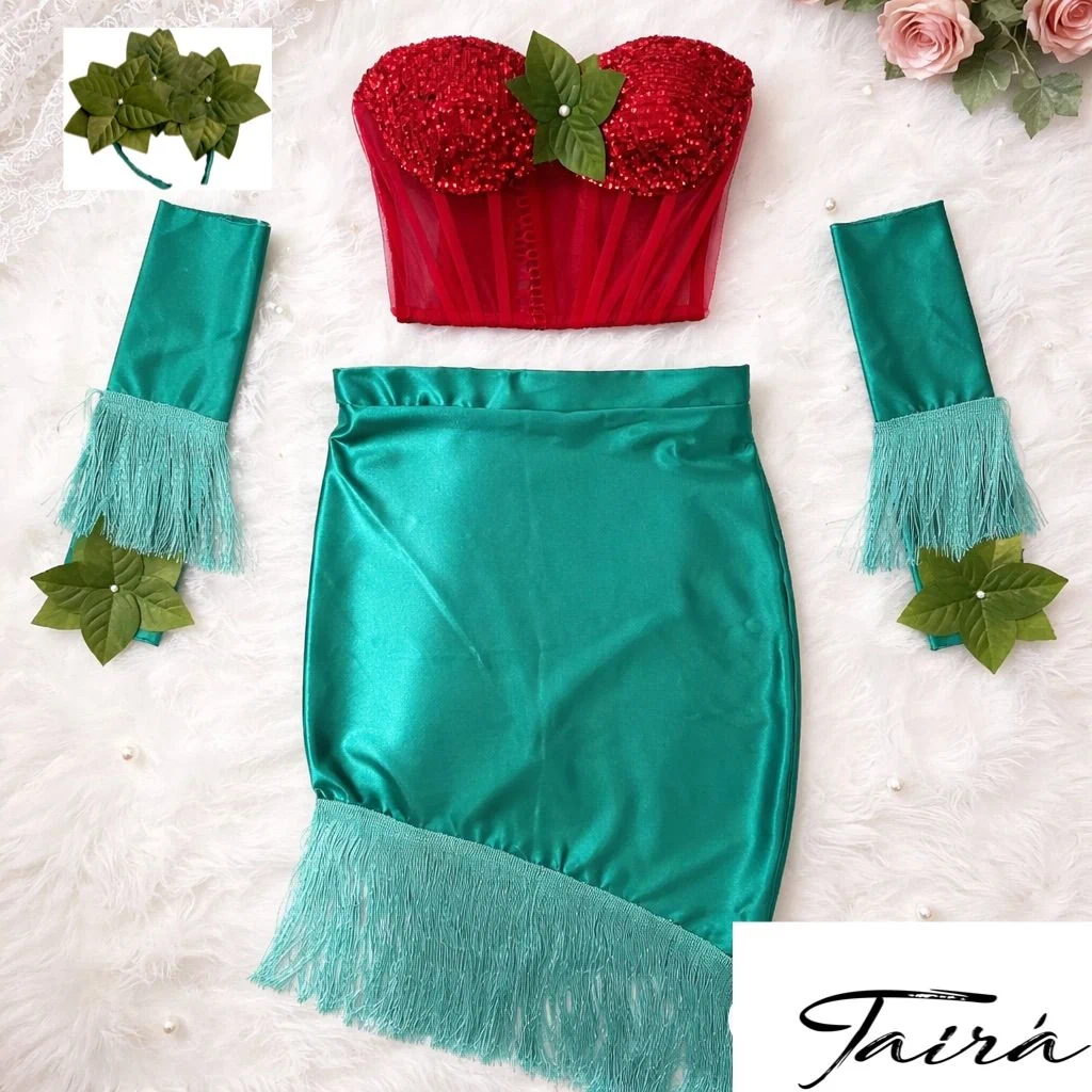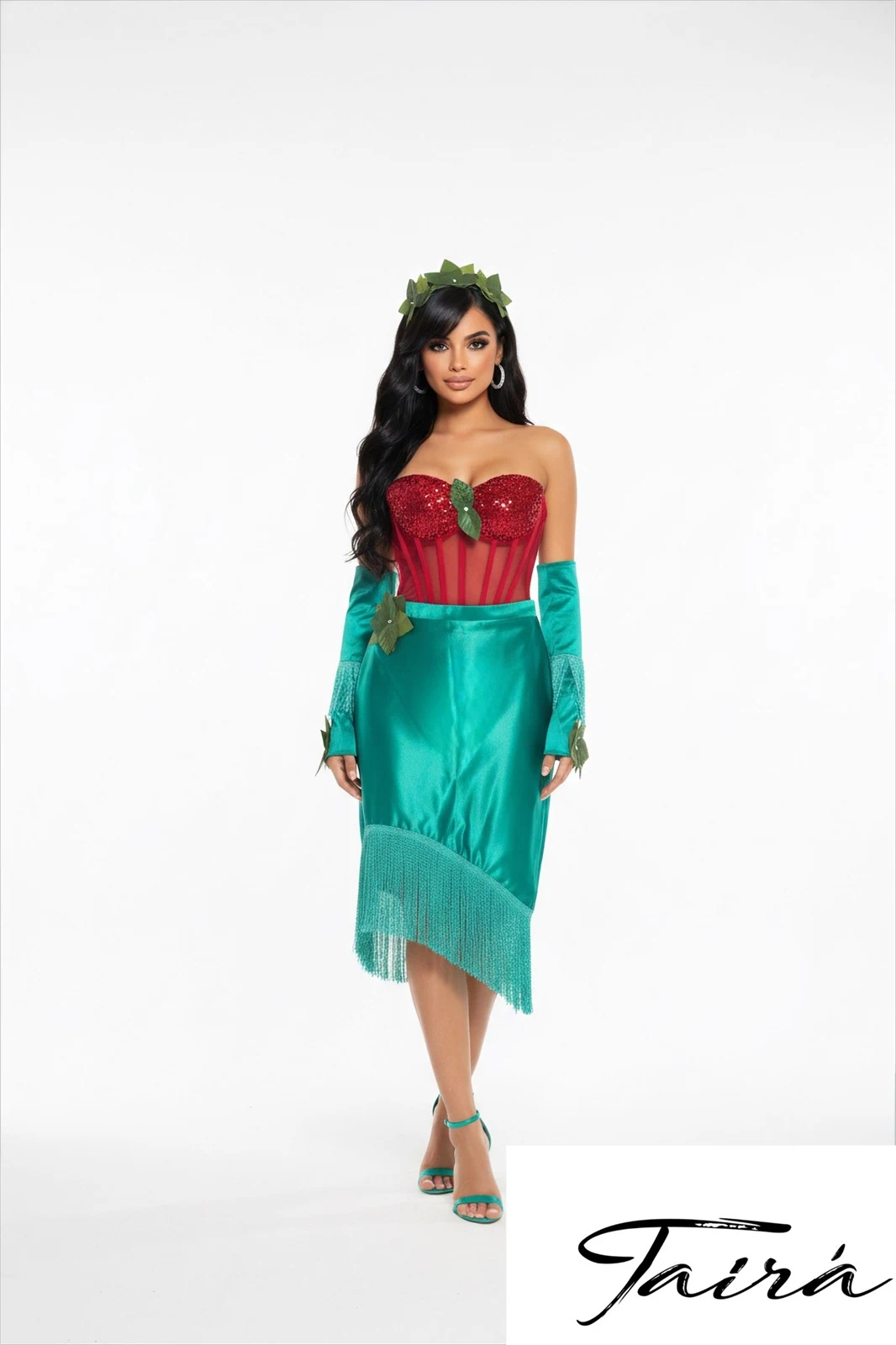 מגיע עם קשת עלים מהודרת, כפפות עם פרנזים, מחוך כוסות חזק וחצאית הוואי פרנזים